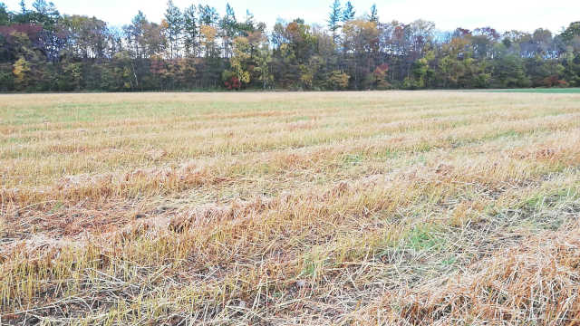 ライ麦収穫後蒔きキタワセソバ、霜にあたって茎が茶色く枯れてから収穫するコンバインに優しい計画。